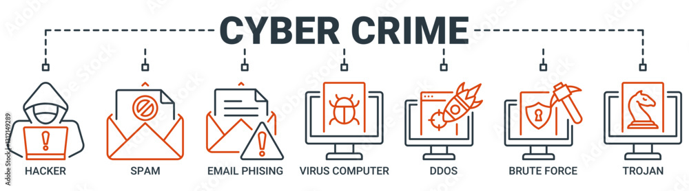 Cyber crime banner web icon vector illustration concept with icon of hacker, spam, email phishing, virus computer, ddos, brute force, trojan icons. Outline vector symbol background. #1312149289