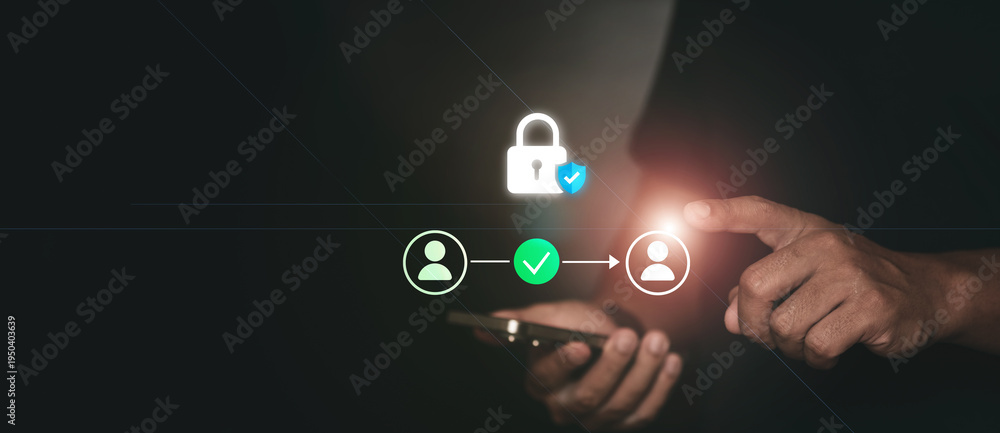 Cyber security concept showing secure mobile payment and digital banking system with glowing lock icon over smartphone representing financial data protection and fintech technology. #1950403639