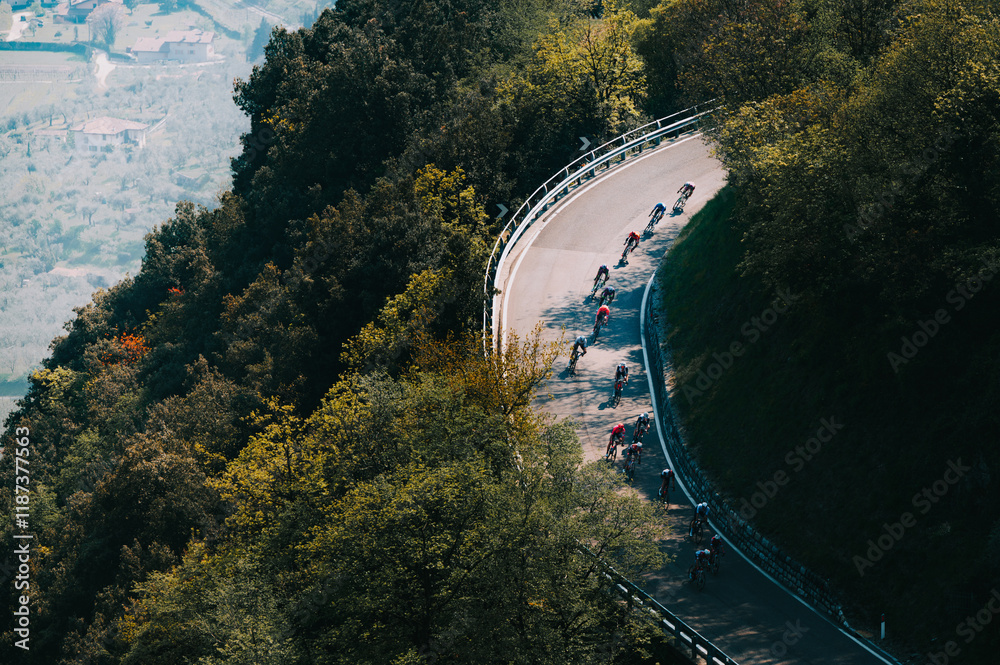 Cycling Peloton Racing Through Green Italian Forests. Profesional Road cycling race in Trentino #1187377563