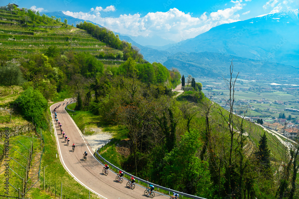 Cycling race in Italy. Peloton descending on the road under blue sky with green trees and orchards in the valley. #1187376683