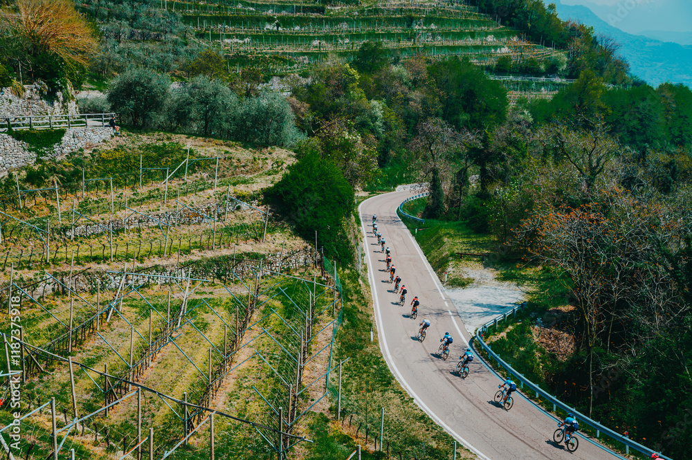 Cycling race in Italy. Peloton descending on the road under blue sky with green trees and orchards. Race dear by lake Garda in Trentino #1187375918