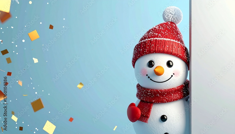 3D Snowman Holding Blank Banner – Christmas Greeting Card Template with Gold Confetti, Happy New Year Winter Holiday Background #1760104386