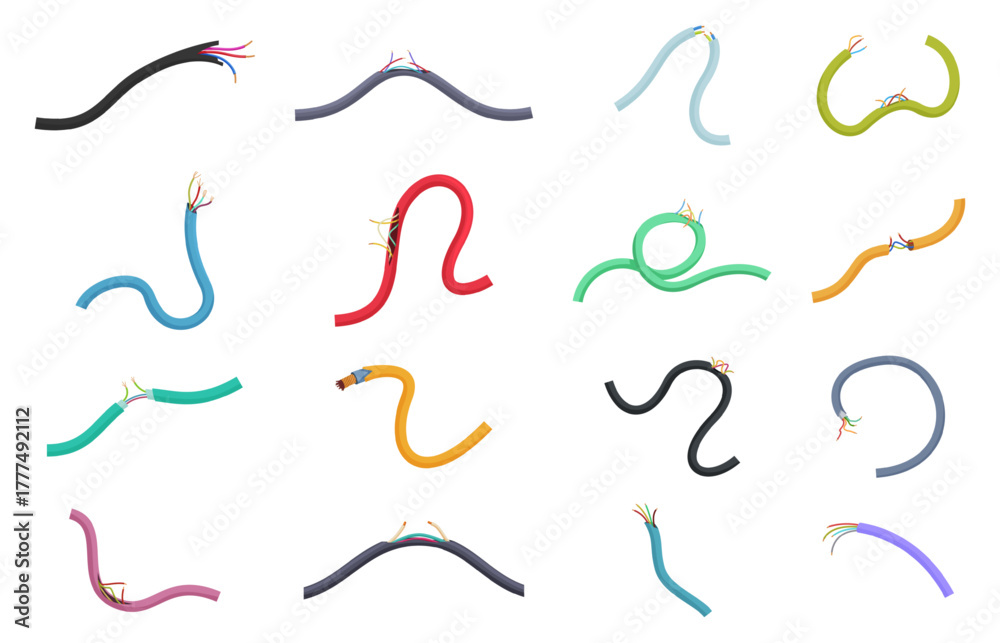 Damaged electrical cables. Electricity problems, broken cable for charge device or communication wires. Electric connects uninsulated, cartoon sapid vector set #1777492112