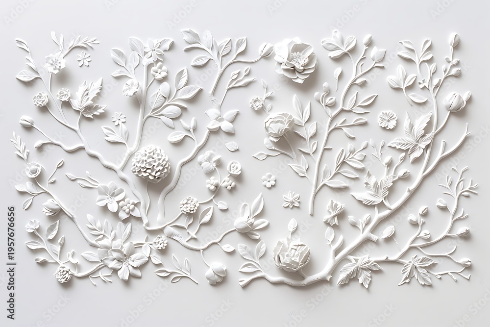 Delicate white floral and botanical relief sculpture on white background Image #1957676656