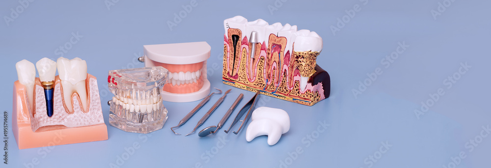 Dental implant and tooth anatomy models with dental instruments on blue background, panoramic dentistry education concept #1955714689