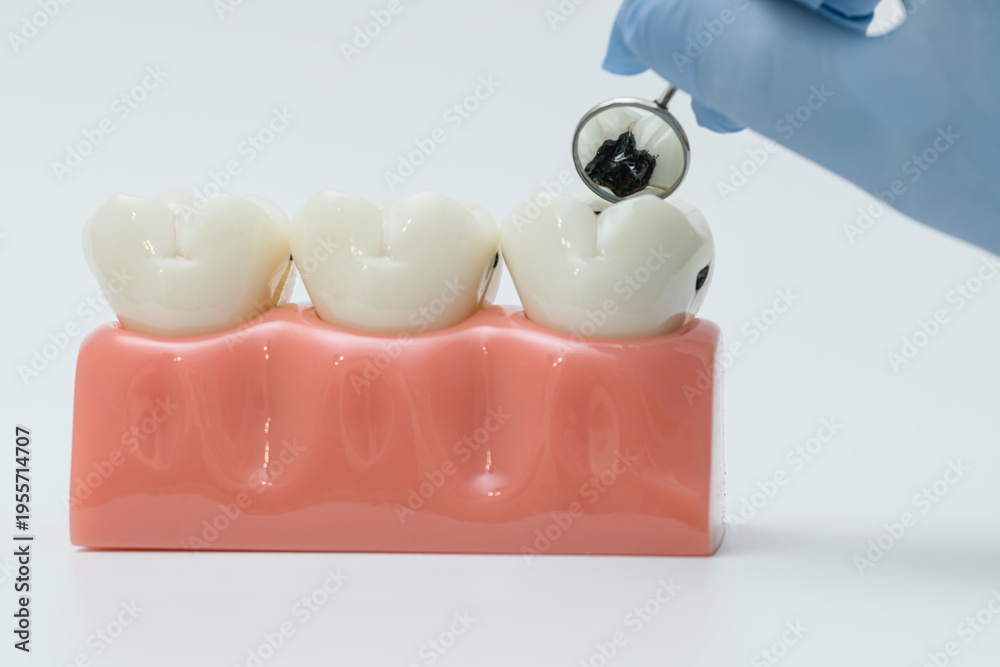 Dental mirror examining severe tooth decay on model #1955714707