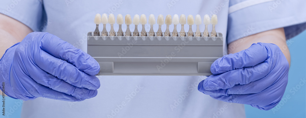 Dentist hands holding tooth shades guide for teeth whitening and professional prosthetic selection. #1973334438