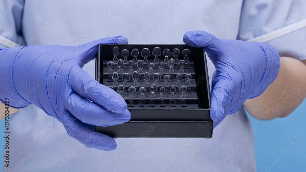 Dentist hands in blue gloves holding a box of transparent dental matrices or clear teeth samples. #1973334337