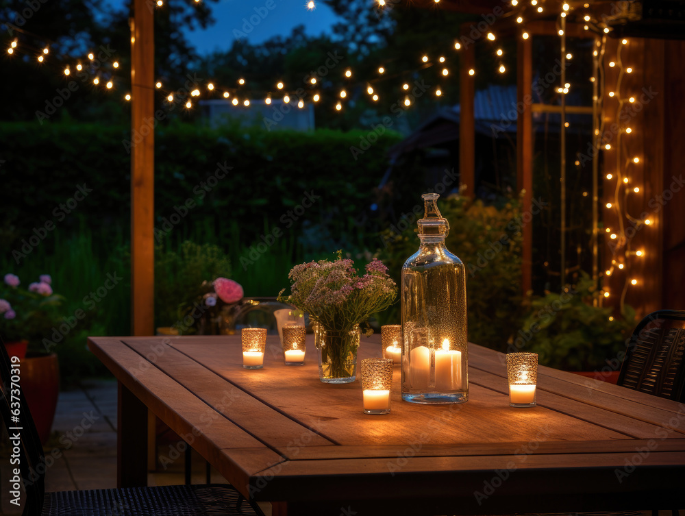 Descripción en español (con menos de 200 caracteres):Fotografía de una elegante mesa de comedor al aire libre, con luces de hadas centelleando arriba y un telón de fondo boscoso. #637370319