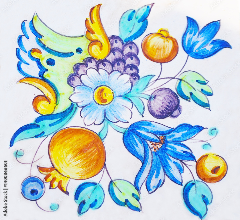 Detail of the traditional tiles from facade of old house. Decorative tiles.Valencian traditional tiles. Floral ornament. #1400866601
