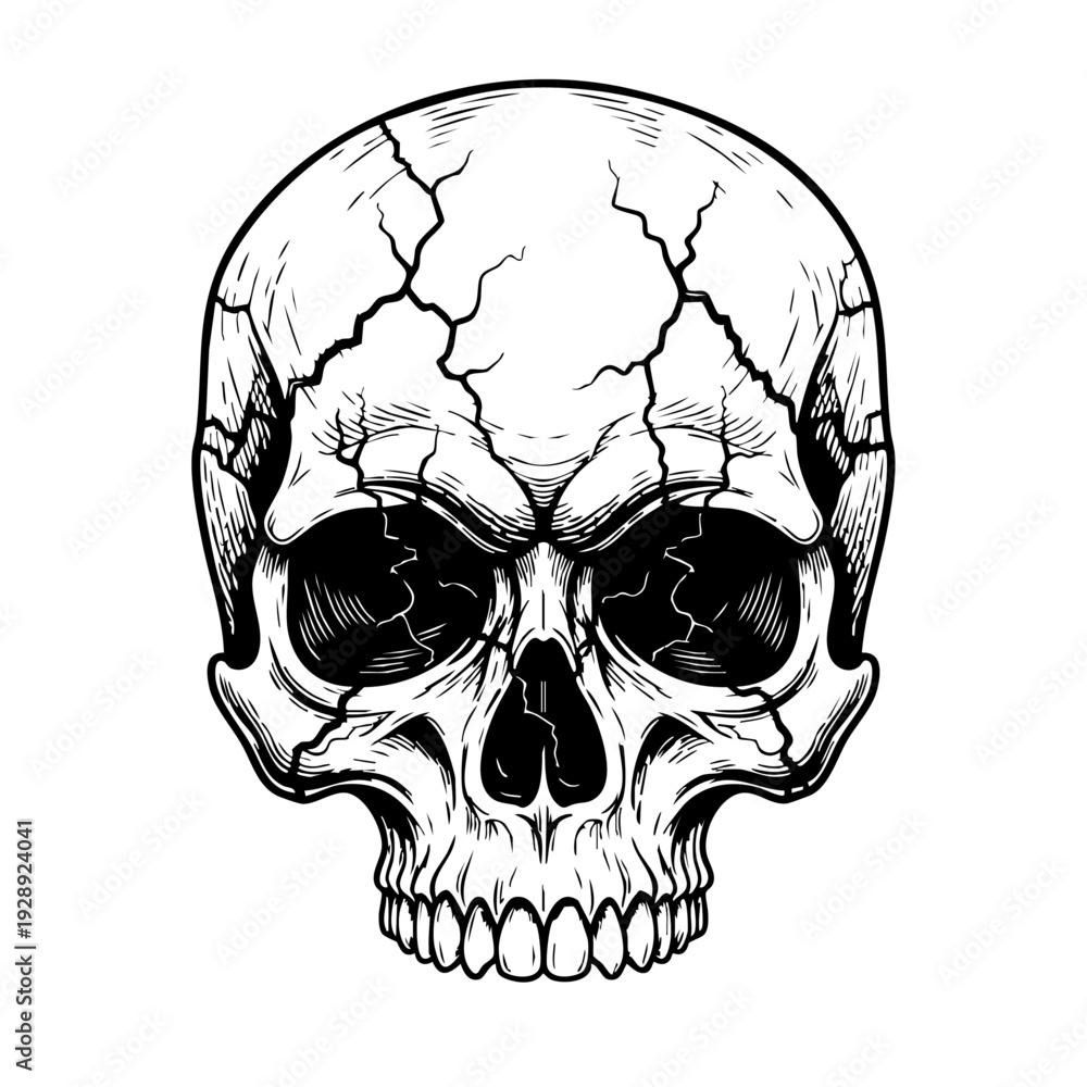 Detailed black and white illustration of a human skull with cracked surface. #1928924041