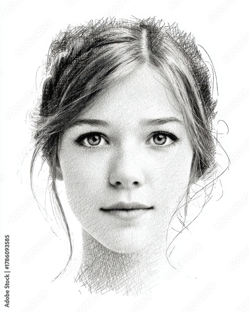 Detailed pencil sketch of a Central European woman with a calm expression #1786093585