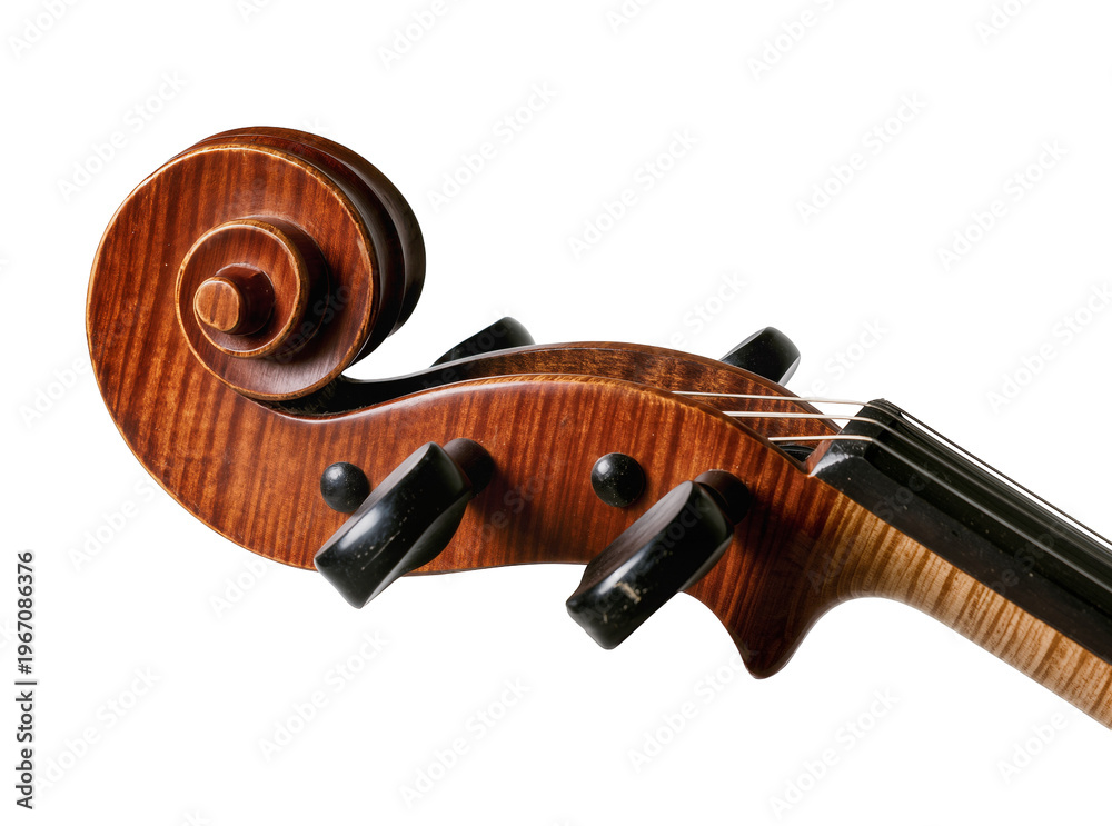 Detailed wooden violin scroll and pegbox, showcasing elegant flamed maple grain and black tuning pegs, isolated, musical instrument part #1967086376