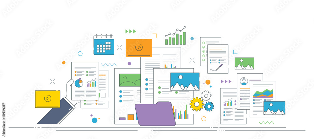 Digital content document and data management, graphs report, videos, photos, folders. #1498196397