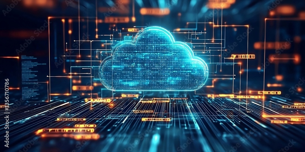 Digital informational technology web futuristic hologram with cloud icon, blue golden light digits and code background, cloud computing. Abstract Motion of digital data flow. Finest generative AI #1356710786