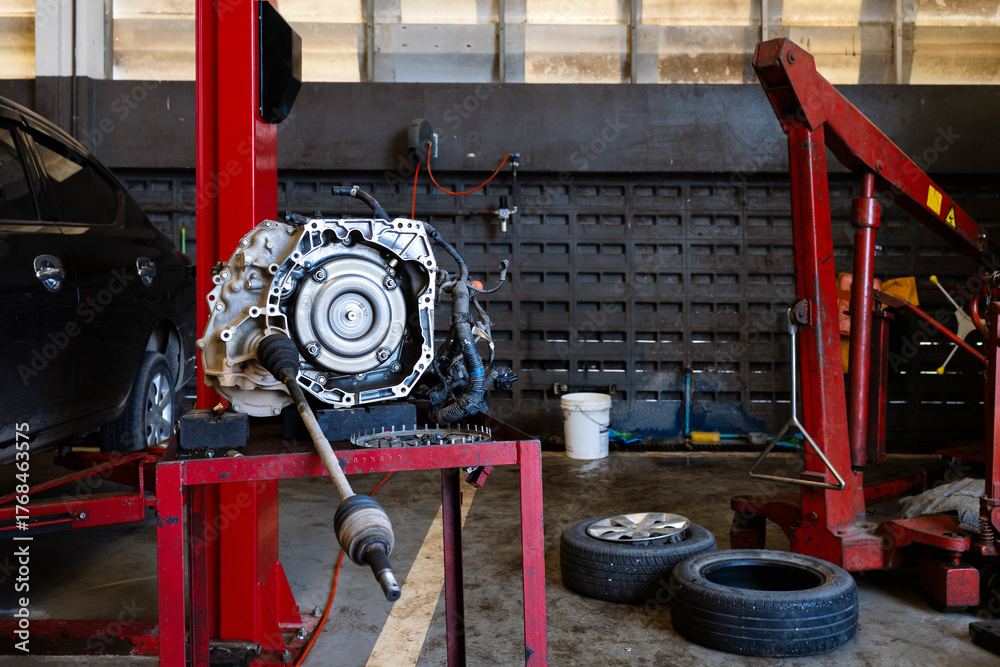 Disassembled automatic transmission and drive axle laid out on a cart in an auto repair workshop. detailed focus on drivetrain repair and service. #1768463575