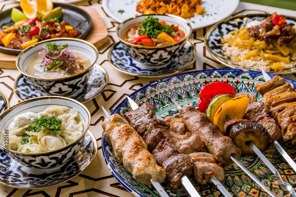 dishes of Uzbek cuisine lagman, pilaf, skewers #258221161