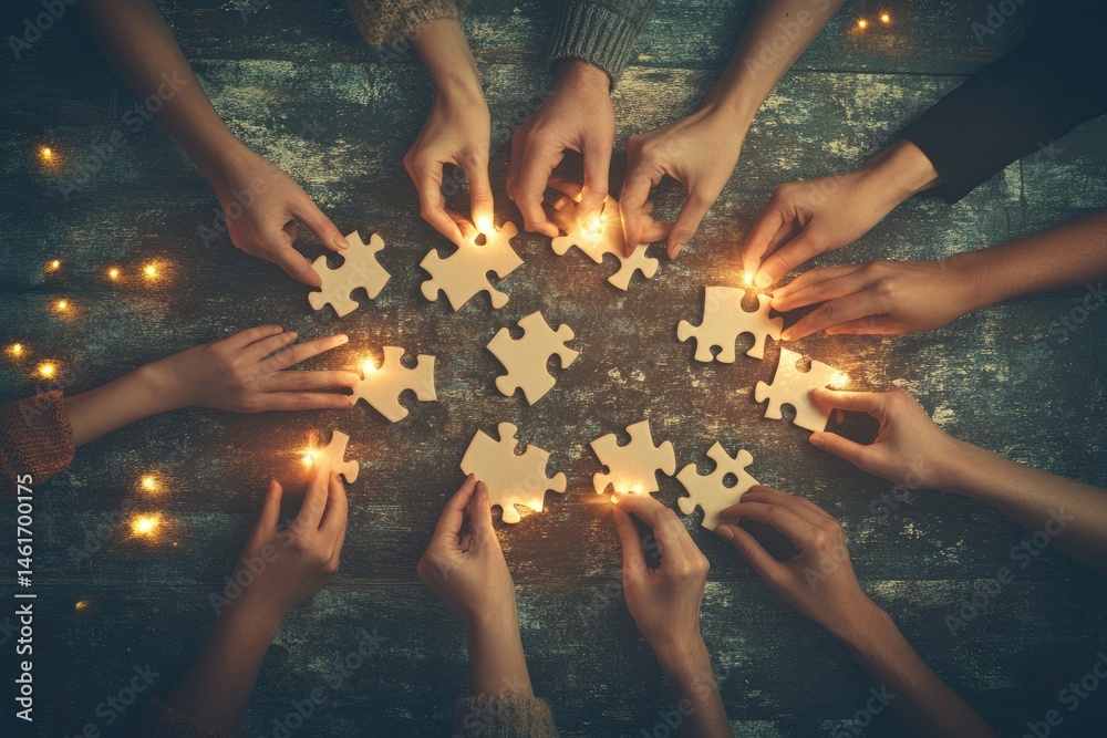 Diverse hands assemble puzzle pieces, illuminated by warm lights, fostering teamwork and collaboration. Many hands around puzzle pieces are lit by tiny lights, creating a warm, cooperative atmosphere #1461700175