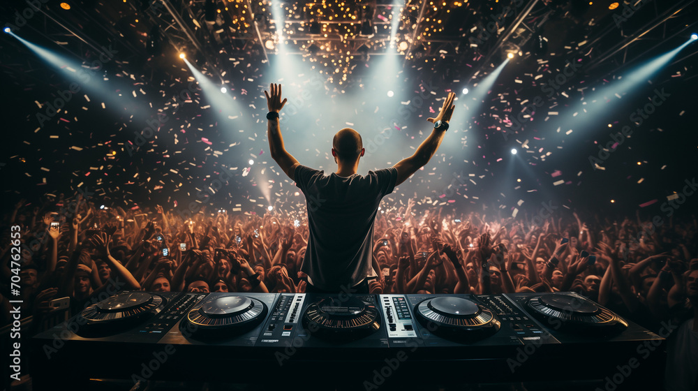 Dj mixing music mixer, dj mixing music, dj at work, close-up, Silhouette of a dancing person in a nightclub, Dj at the concert, Dj playing on stage with huge party crowd in front, Ai generated image #704762653