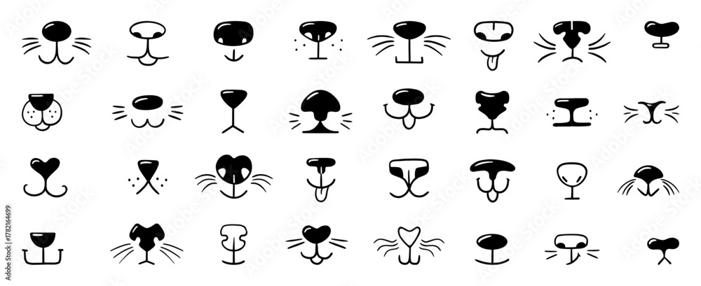 Doodle animal noses. Cats nose with mustache, face parts of dog puppy rabbit kitten. Wild animal care logo, hand drawn neoteric vector elements #1782164699