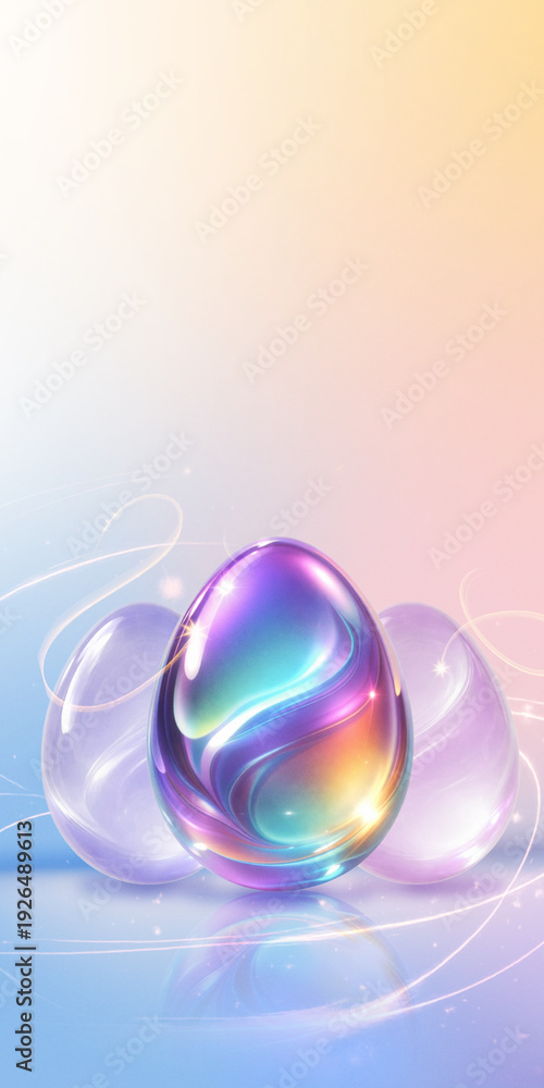 Dreamy artwork iridescent Easter eggs with light trails. Concept of fantasy style spring campaign visual, digital greeting banner and colorful seasonal branding template. #1926489613