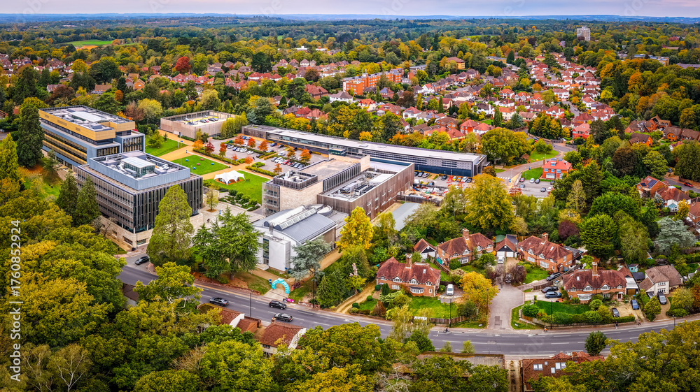 Drone image of Southampton University's engineering campus with modern buildings, green courtyards, and tree-lined surroundings in an urban residential setting #1760852924