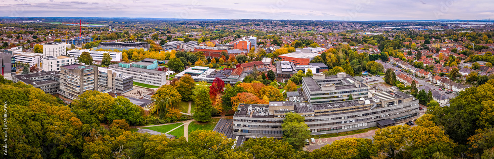 Drone photo of Southampton University buildings integrated into the suburban cityscape, surrounded by autumn trees and residential areas #1760852953
