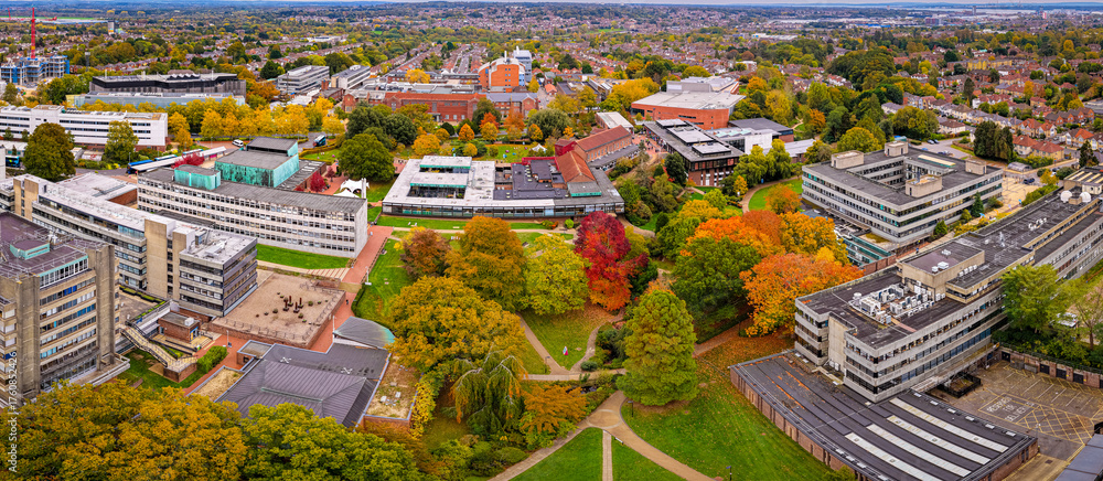 Drone shot of Southampton university buildings surrounded by colorful autumn trees and walking paths, ideal for education or seasonal campus lifestyle themes #1760852426