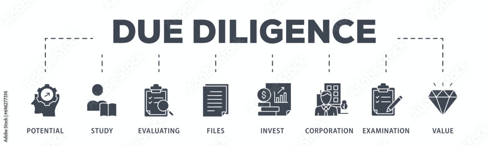 Due diligence banner web icon glyph silhouette with icon of potential, study, evaluating, files, invest, corporation, examination and value #646277514