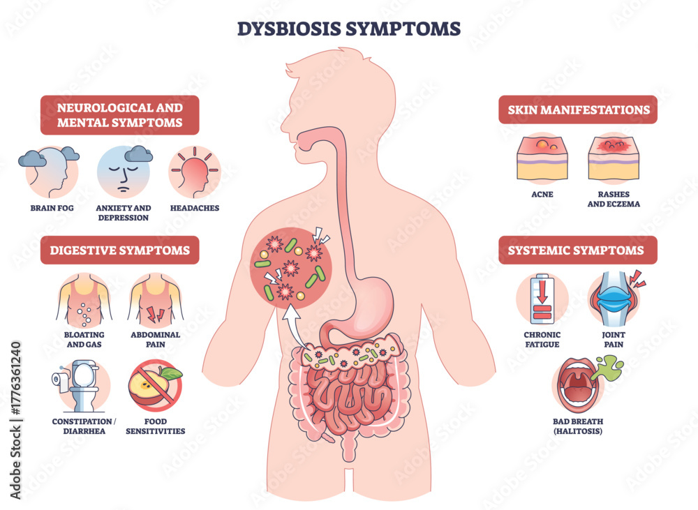 Dysbiosis symptoms visual shows gut imbalance across body, human silhouette with intestines and bacteria icons highlights digestive, skin, mental signs. Outline diagram #1776361240