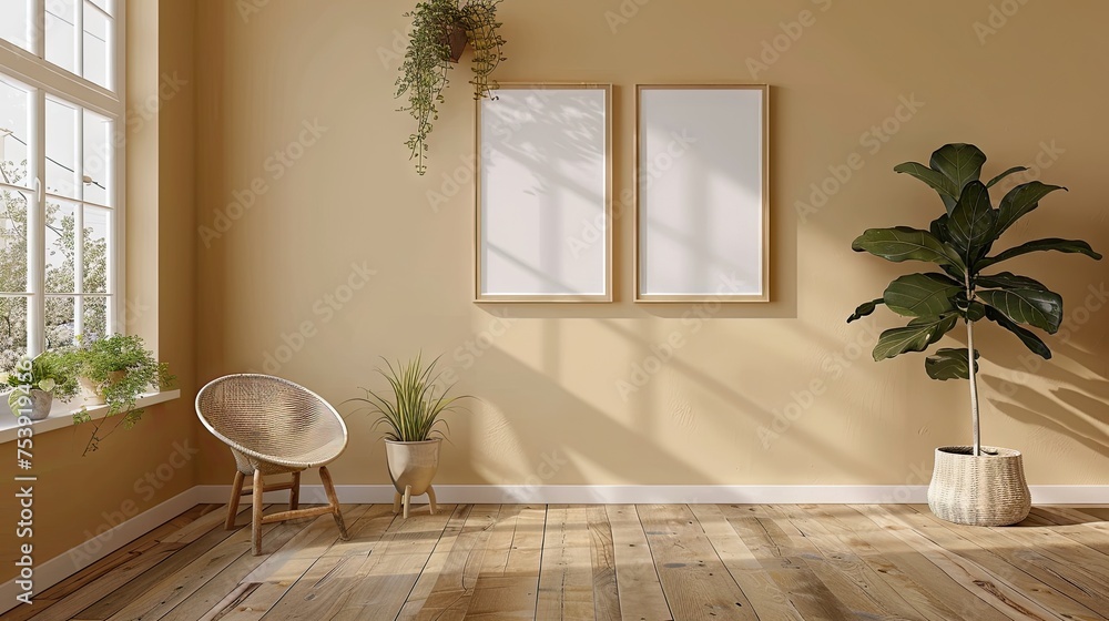 Eco Friendly Home Interior House Beautiful Design Ideas Concept Clean Warm Space Natural Material Soft Touch And Techture With Decoration Frame On Beige Wall Mockup Room Interior Background Creation #753919456