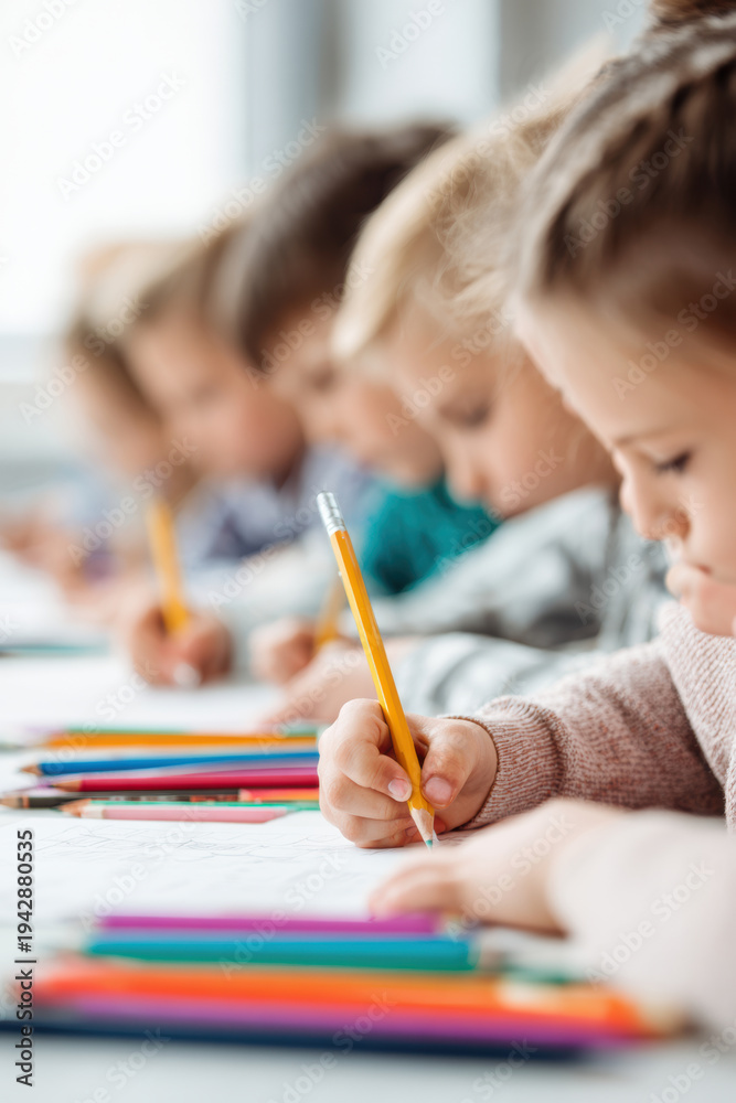 Education training class. Knowledge learning improvement study. A group of children sitting at a table, each holding a pencil and drawing on a piece of paper. #1942880535