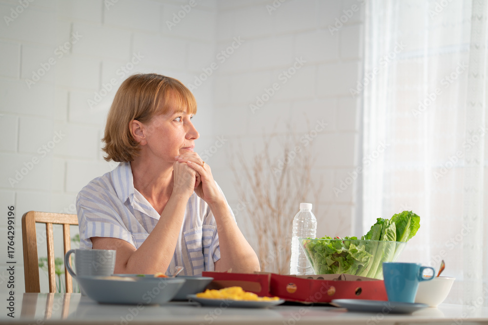 Elderly retired grandmother stay at home with painful face sitting alone on eating table in house. Depressed mature senior old woman upset feeling unhappy. Lonely and missing his family at home #1764299196