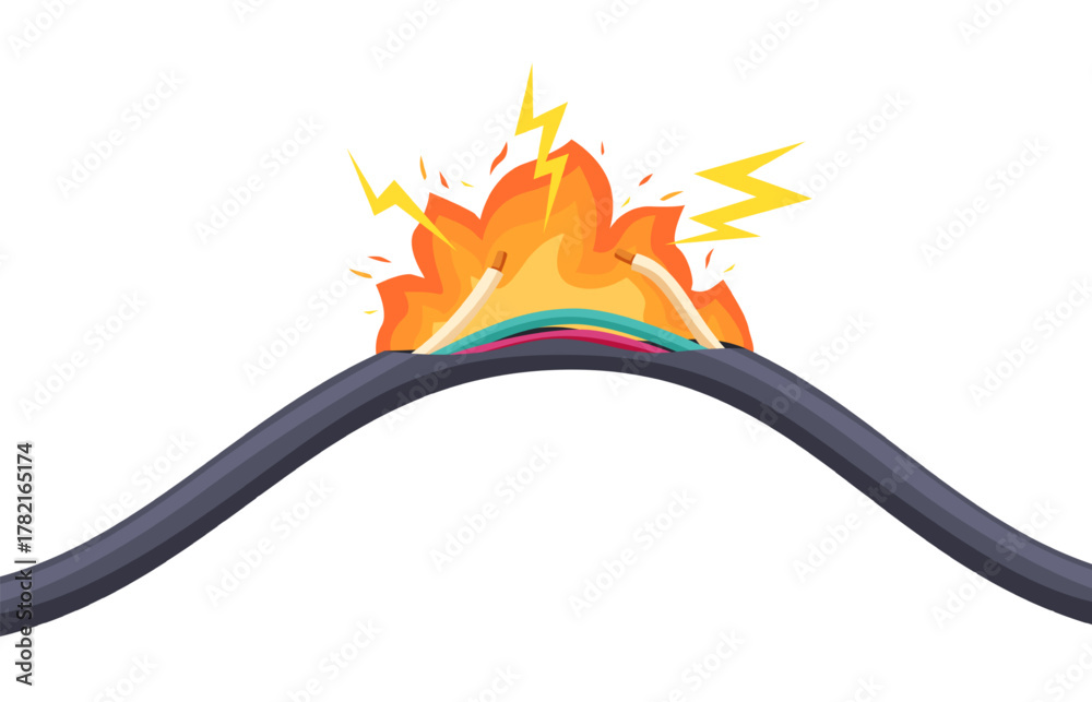 Electrical short circuit background. Burning uninsulated cable, household office power grid failure. Damaged wire with fire flame, sapid vector element #1782165174