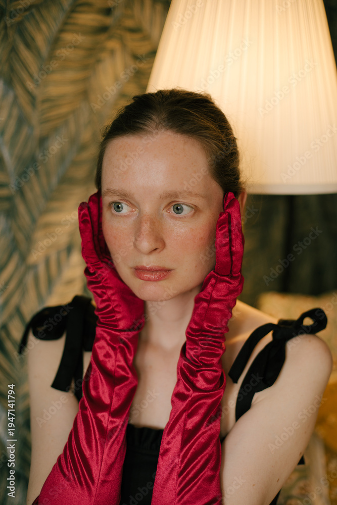 Elegant freckled woman in black dress and red gloves posing in vintage interior with soft lamp light. #1947141794