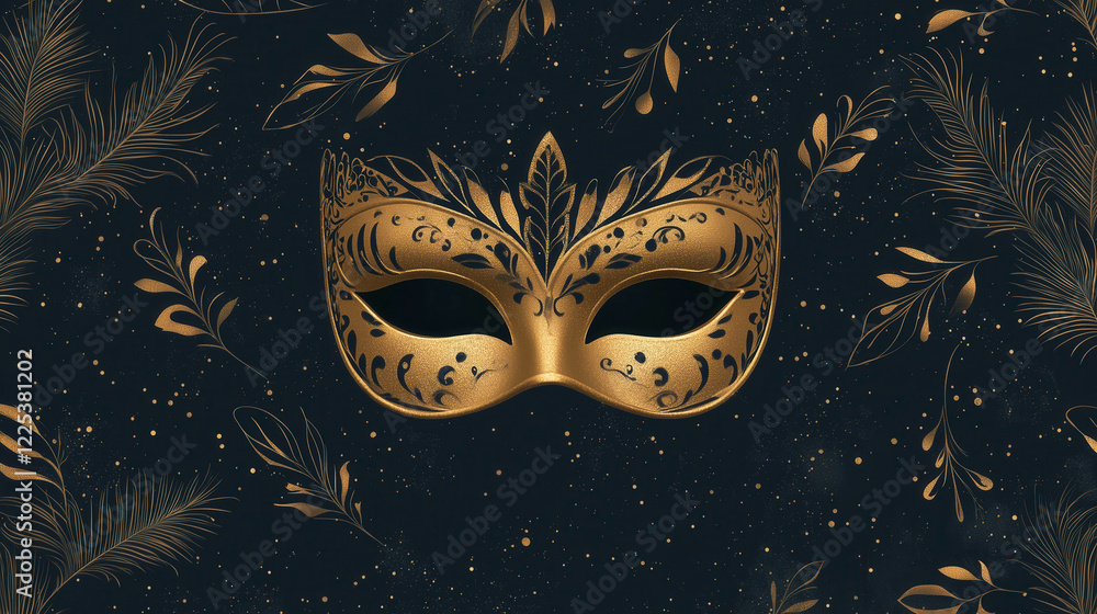 Elegant venetian carnival mask on dark blue background with golden feathers #1225381202