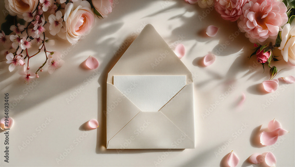 Elegante sobre crema abierto con tarjeta blanca, rodeado de dalias rosas, cerezos en flor y pétalos bajo sombras suaves y luz cálida. #1964803406