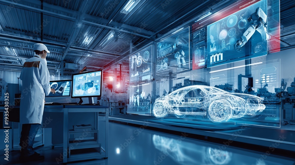 Engineer with computer starts smart electric car factory. Screens display robots, assembly line, data streams, and computer vision improving how things are made. #1935430325