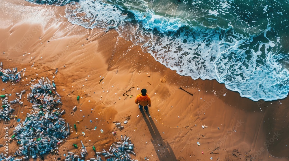 Environment, Ecology Care, Renewable, Esg, Environmental, Social And Corporate Governance Concept. Person Standing And Looking At Plastic Bottle Waste On The Beach Sand. Top View #753920183