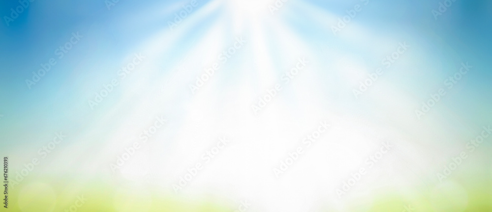 ESG concept, abstract blurred beautiful soft green bokeh light grass and blue sky autumn sunrise background #676210393