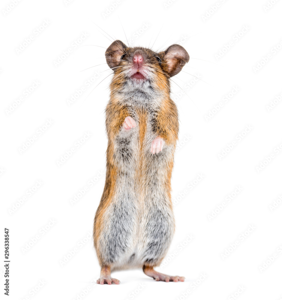 Eurasian mouse, Apodemus species, rearing up in front of white #296338547