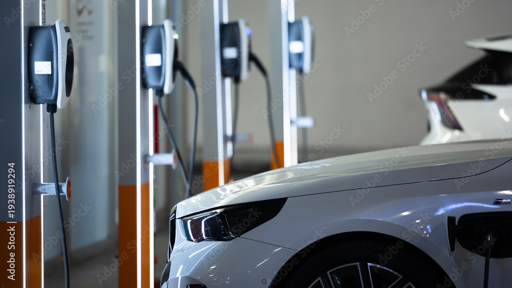EV charging and electric car, Electric car charging station for charge EV battery, Plug for vehicle with electric engine, EV charger clean energy, Charging point at car parking lot #1938919294