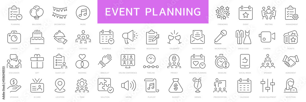 Event planning thin line icons set. Party, birthday, event organization, celebration icon. Editable stroke. Vector #1586340553