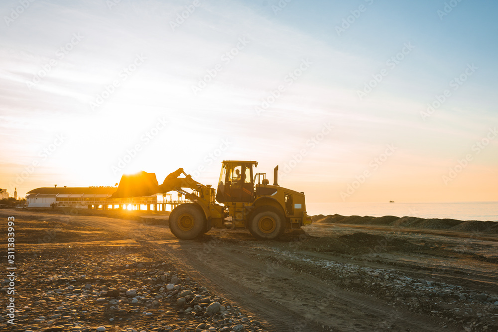 Excavator loads the excavation onto a truck (hydraulic)are heavy construction equipment consisting of an arrow,a bucket and a cabin on a rotating platform.On the beach with the sea and the setting sun #311383993