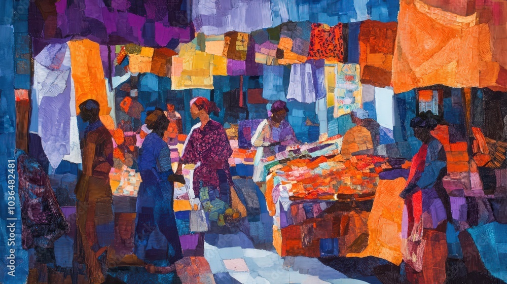 Fauvist market scene with expressive colors and dynamic composition. Bold blues, purples, and oranges depict energy and movement. Art concept for design and print. #1036482481