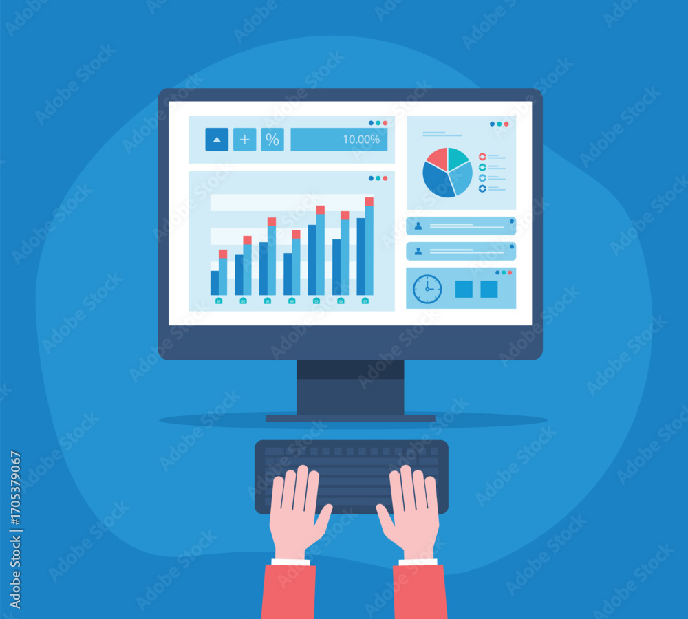 flat vector business people hand working on computer. and design concept business data analytics with report graph moniter. and business finance investment growth concept #1705379067