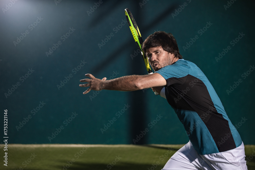 Focused sportsman striking tennis ball mid action training for professional tournament #1753221146