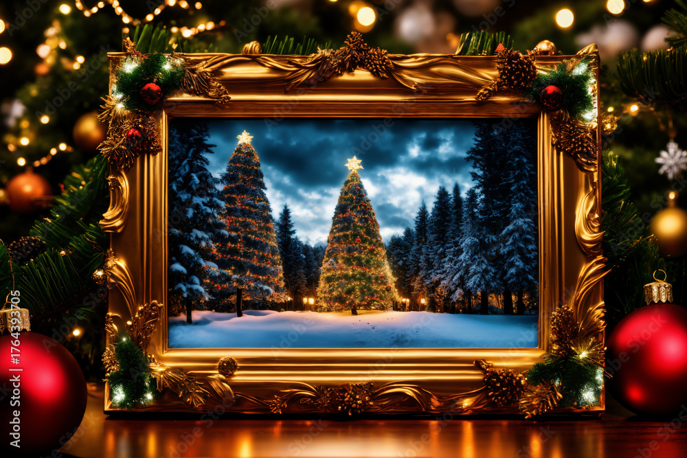 frame decorated with garland for New Year and Christmas holidays, with view of winter landscape inside, beautiful winter nature like a fairy tale #1764393705