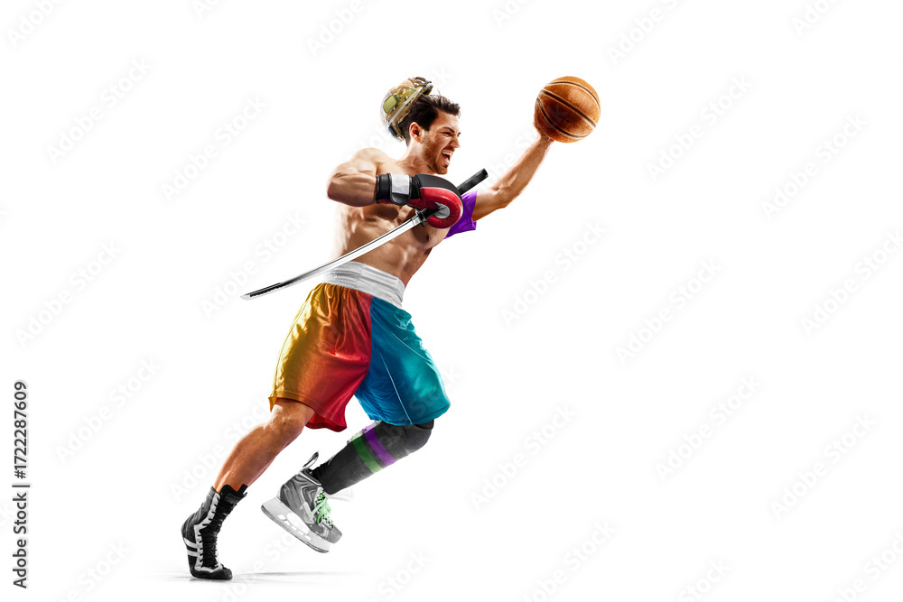 Funny collage of many kinds of sports and hobbies in one person. Multi sports. Boxing, gym, basketball, soccer, cycling, ice hockey, fitness, american football, skateboarding, baseball, volleyball etc #1722287609