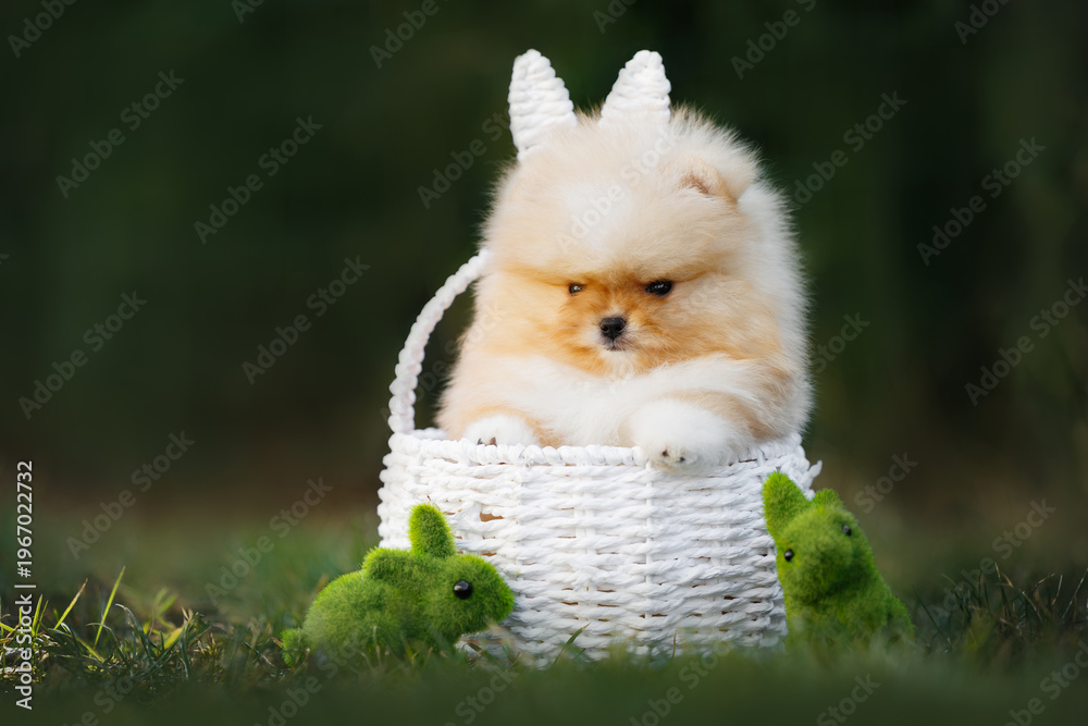 funny pomeranian spitz puppy with an angry expression posing in a white basket #1967022732